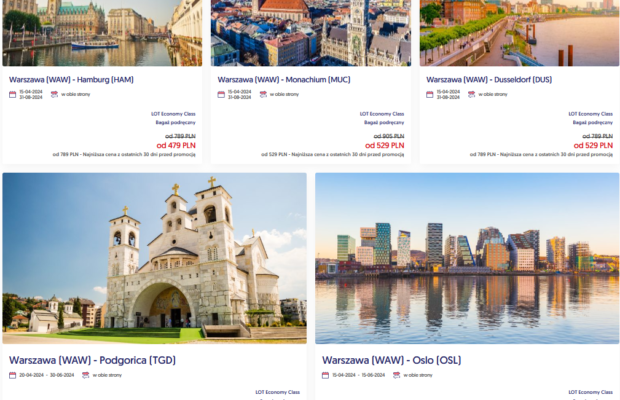 O północy 27 marca wystartowała kolejna edycja cyklicznej promocji Polskich Linii Lotniczych LOT pod nazwą „Szalona Środa”. Tym razem z polskich lotnisk polecimy w atrakcyjnych cenach w dwie strony w następujących kierunkach: Hamburg, Monachium, Dusseldorf, Podgorica i Oslo. Oferta dotyczy również lotów z portów regionalnych. Do wyboru są bilety z bagażem podręcznym, rejestrowanym oraz loty w taryfie elastycznej. Bilety do kupienia są między innymi na oficjalnej stronie LOT.com. Tanie noclegi zarezerwujecie na Booking.com. Promocja potrwa do końca dzisiejszego dnia.